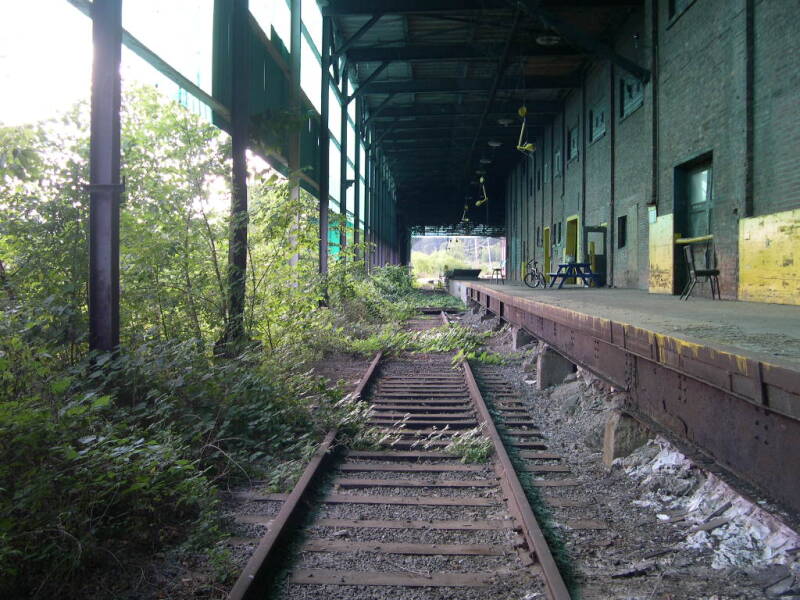 The conveyor from the wood room to the digester building carried freshly de-barked 4-foot pulp logs. The main track into the mill switchbacks passed under this.