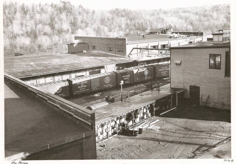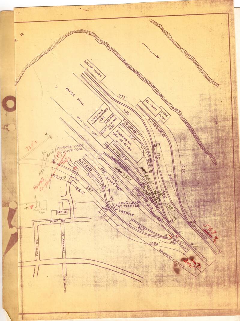 This is the Mill around 1960, the bulk of the pulp logs are being brought into the mill on rail cars, both boxcars and pulpwood cars.